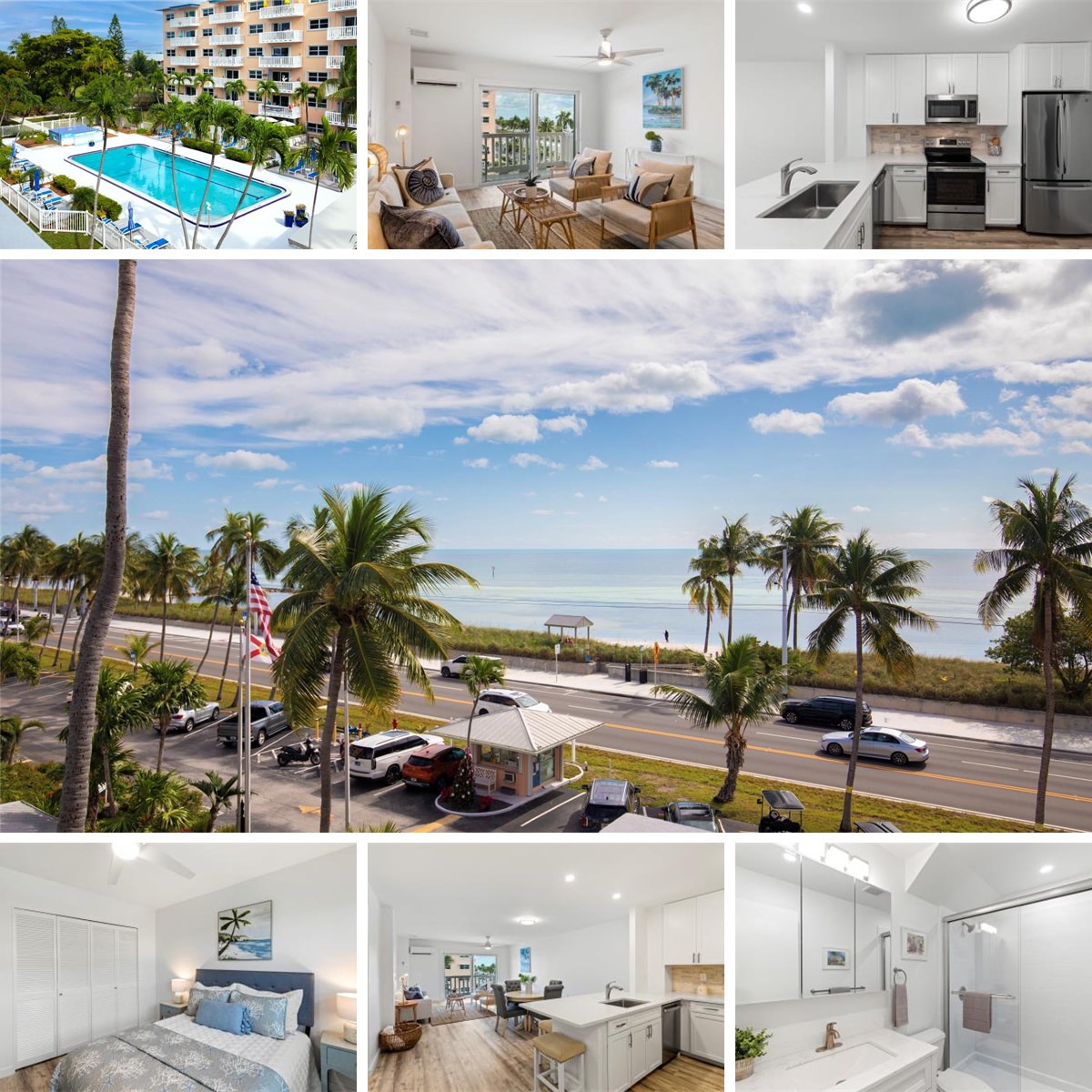 Spectacular sunrise ocean views from this beautifully renovated Key West By The Sea condo on Smathers Beach. This 2-bedroom, 1.5-bath residence feels like new construction, featuring a fully remodeled kitchen with new appliances, updated bathrooms, new flooring throughout, dimmable lighting, new fans, and more. The Mitsubishi mini-split AC and heating system, upgraded electrical panel, water heater, and hurricane-impact soundproof doors and windows are all in pristine condition. Enjoy unobstructed views from the balcony overlooking Smathers Beach and the Atlantic Ocean, with paddleboard, kayak, sailboat, parasail, chair, and umbrella rentals just steps away. Key West By The Sea is a gated community offering two swimming pools, two tennis courts, a clubhouse, four laundry rooms, a car-wash station, bike racks, a pet-walking path, and lush fruit trees. This pet-friendly community includes building insurance, cable TV, Wi-Fi, and building/grounds maintenance in the condo fee.